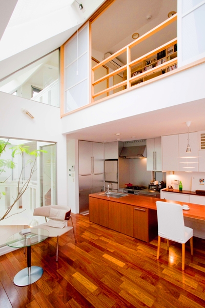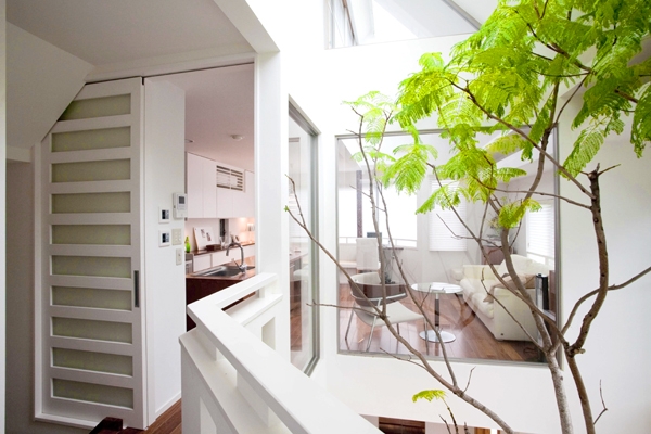 トップライトからの光が家全体に行き渡る明るい住まいに。1. 光があふれ、風が通り抜ける 2. 都市型の密集地でも充実した開放感とプライバシーがしっかりと確保。 3. ダニ、結露対策にも有効 4. 家の中に中庭をつくり、5m以上の植栽を植えることによって家に居ながら森林浴を楽しめて健康になり、家族に安らぎのシンボルツリーとして機能します。 5. 屋根のトップライトや上部から入る光は、1階の隅々まで入り、1階が日の射さない部屋でもトップライトの光は明るくします。