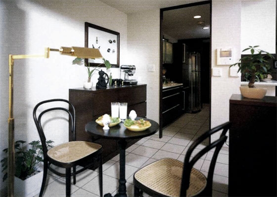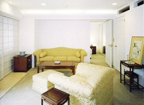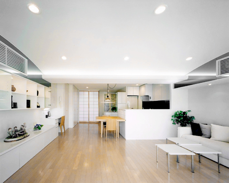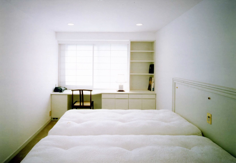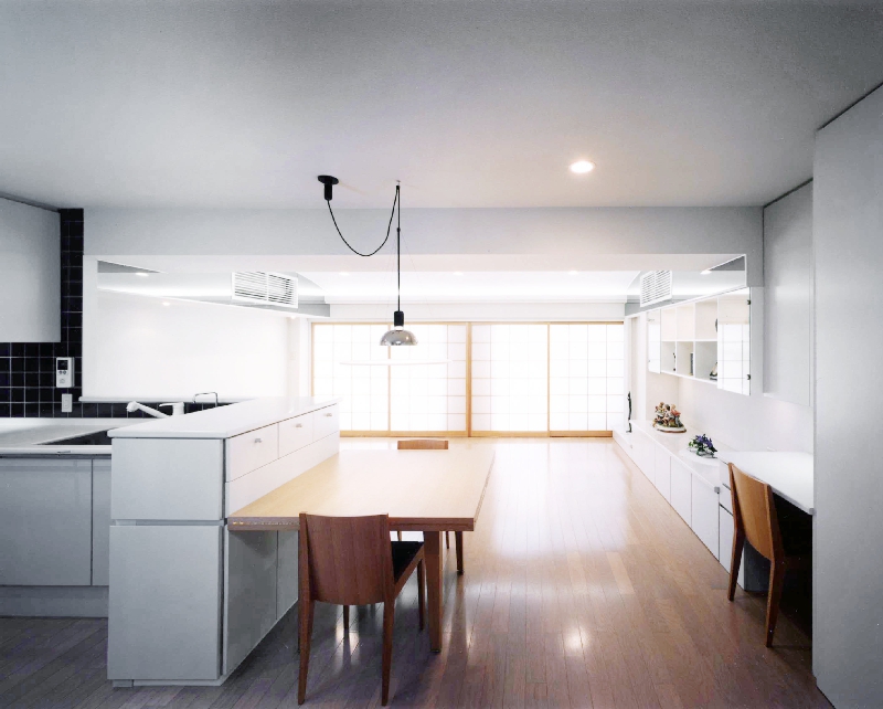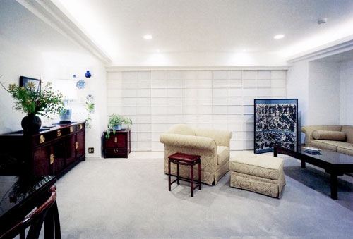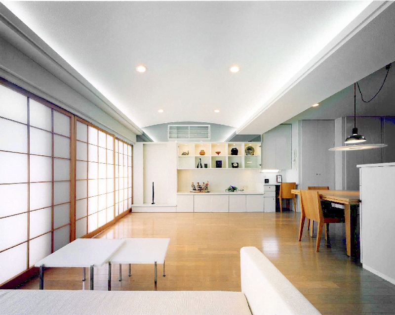 もともと2LDK+Kだった間取りも、生活の基盤は神奈川に残すため、こちらでは利便性を重視。リビングをゆったりと使いたいという希望から間取りを含めて全面リフォームを計画したのです。「外国人が日本に住んでいるイメージ」を念頭に、ご夫婦で香港旅行の際に見つけたリビングの家具や絵画などのインテリアに合わせて、白い塗壁とモダンな障子を用いるなど落ち着きのあるデザインを検討。週末をのんびりと暮らすご自宅とは違い、機能性を重視した室内は備品にもこだわり、シンプルで飽きのこないデザインに統一されています。また、仕事への緊張感を保つため各部の収納も充実させ、生活感を目立たせない工夫が随所に凝らしております。