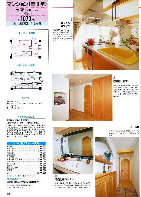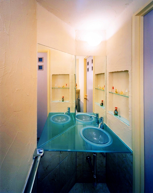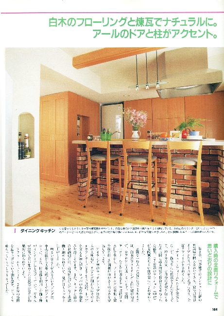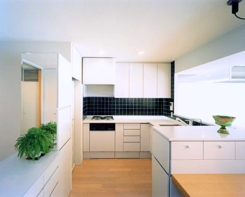 銀座でイタリアン料理店を経営しているYさんは、長くイタリアに住んでいたため、マンションも壁には白のスタッコ仕上げ、床はパインの無垢材やレンガなどを使い、とても明るい住まいが出来ました。洗面カウンターを広く使いたいため、洗濯機はキッチンの後の収納BOXに設置しています。