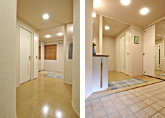 部屋数をいかに多くするかだけを考えた間取りで、収納も少なく部屋はモノであふれてしまいます。リフォームの依頼があったご家族の家族構成は、ご夫婦と1歳のお子様です。Yさんご夫婦は、部屋数よりも家族が一体となれる、コミュニケーションの取りやすい家族空間を希望されました。設計ではリビング・ダイニングを充実させて多目的で、多機能空間とし、廊下の面積を限りなくゼロに近づけました。 玄関ホールの引き込み戸からリビングの空間になります。 子育てと勉強は常に両親の気配が感じられるダイニングで、コミュニケーションを図りながら行うことを可能にしています。 3LDKから1LDKに減築してとても喜ばれています。子供の成長に合わせ、子供のベットルームをつくるプランを用意しておき、家族の成長に合わせて住いも成長するリフォームにしました。